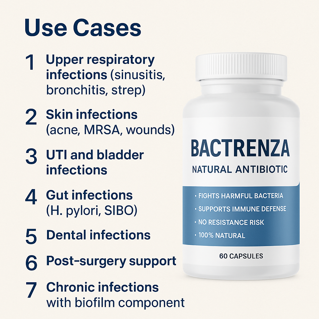 BACTRENZA™ is a breakthrough natural solution designed to combat bacterial infections without compromising your gut or building antibiotic resistance. It delivers real clinical power from nature’s most potent antimicrobial herbs and extracts.