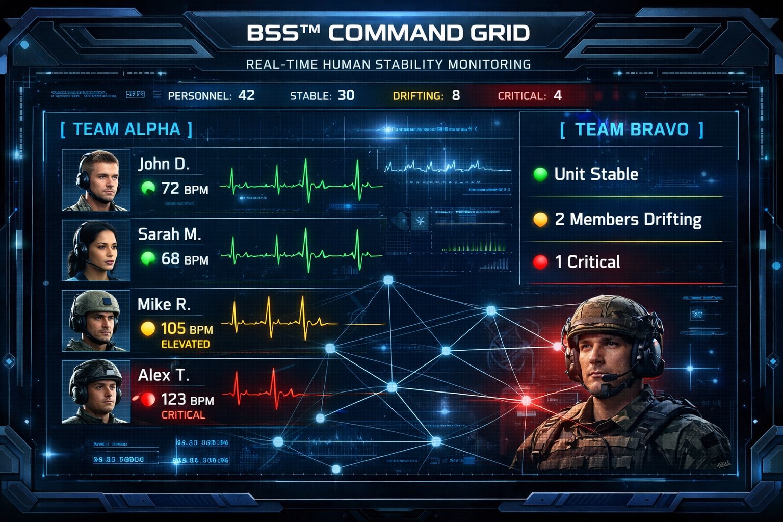 Unlike standard wearables, BSS™ is predictive and adaptive, identifying patterns across multiple signals rather than relying on fixed thresholds. It delivers real-time intelligence at both the individual and command level.