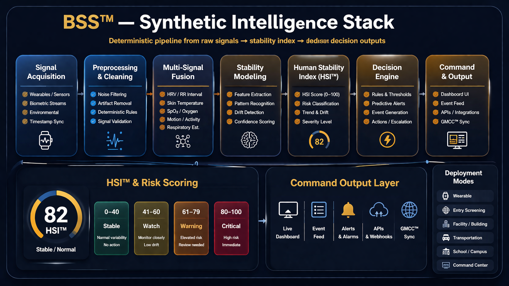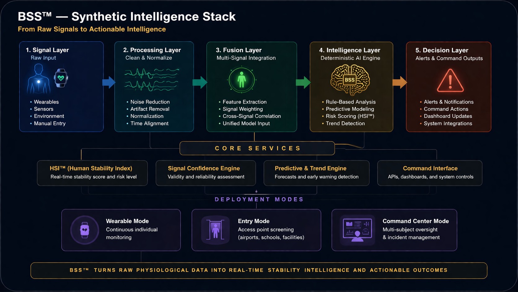 BSS™ is an engineered Synthetic Intelligence platform built to detect physiological instability in real time. It combines raw signal acquisition, deterministic processing, multi-signal fusion, Human Stability Index scoring, predictive alerting, and command-level outputs into one deployable system for wearable, entry, and command-center environments.