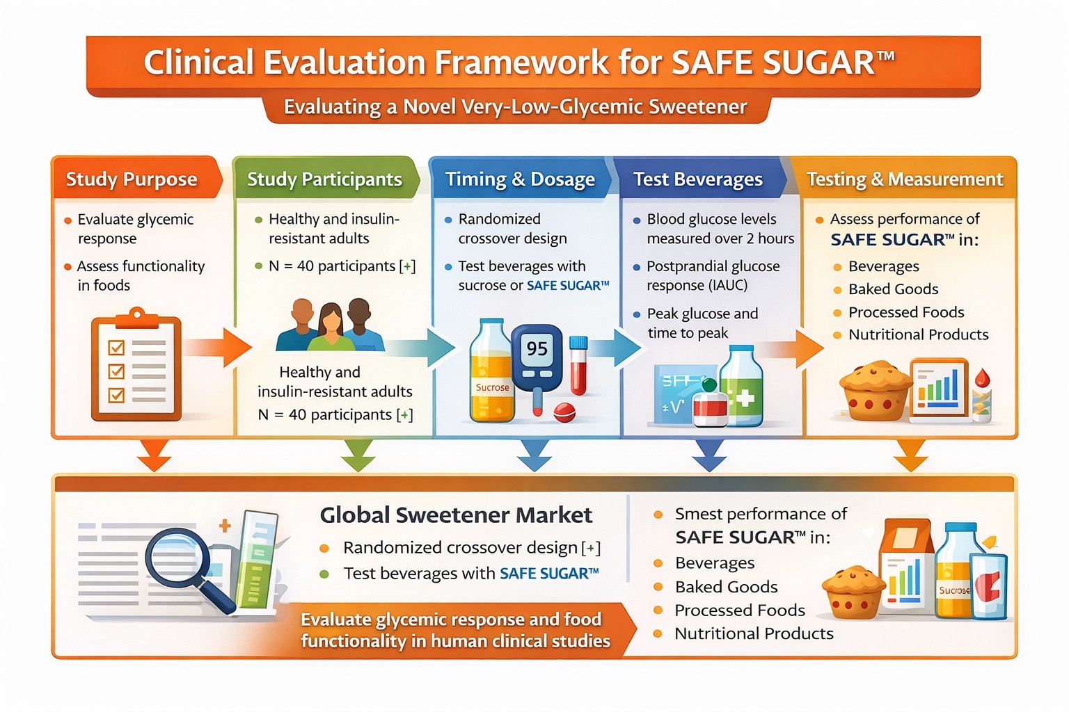 The evaluation framework is based on a randomized crossover design comparing traditional sucrose with SAFE SUGAR™ in human participants.