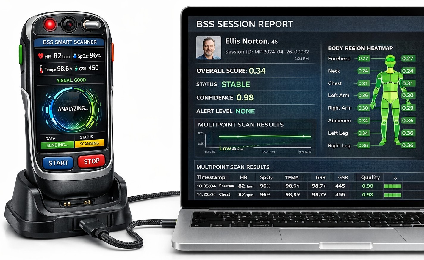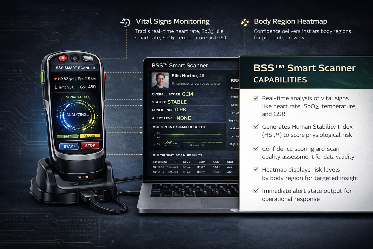 The BSS™ Smart Scanner is a front-line detection device engineered to identify physiological instability before obvious visible breakdown appears. It is designed to support scanning, review, and immediate awareness in environments where early signal recognition can improve operational response.