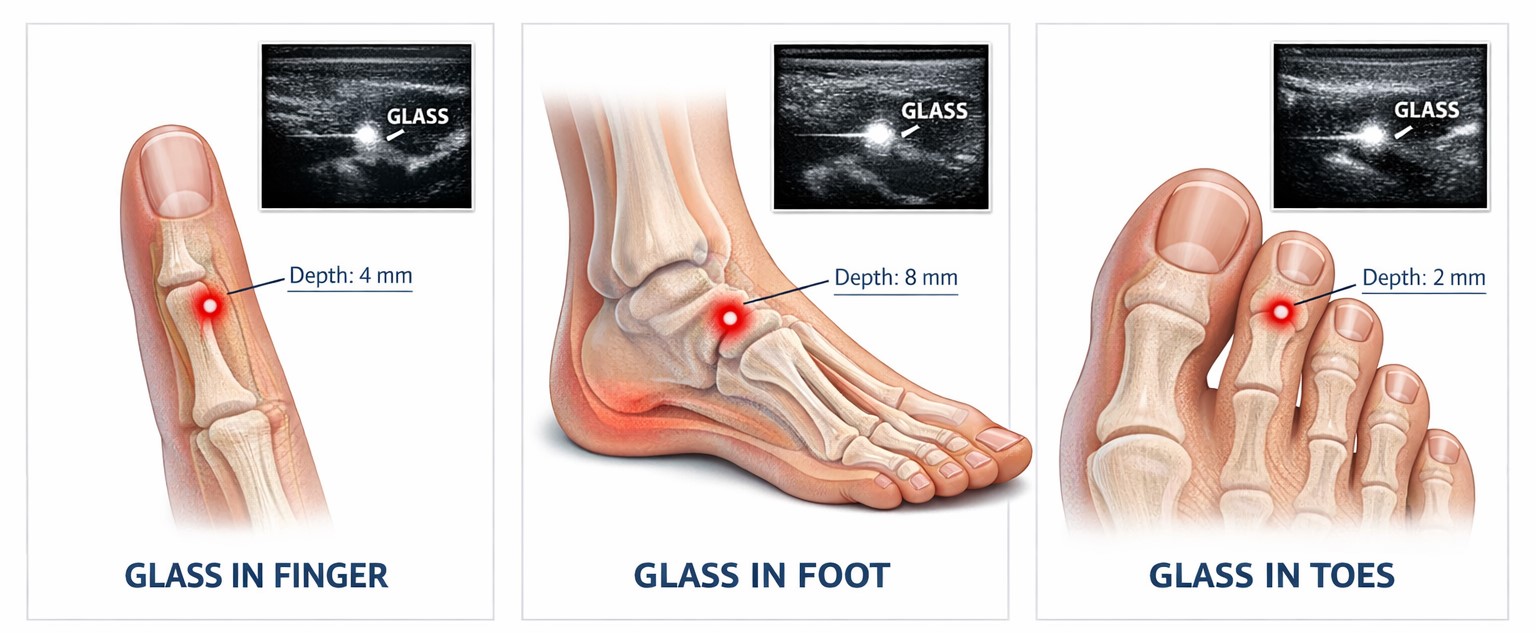 GlassFind™ may be applied in podiatry, urgent care, wound care, occupational injury assessment, minor trauma evaluation, and first-response screening environments where retained glass fragments are suspected.