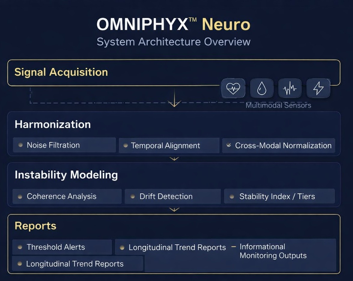 OMNIPHYX™ Neuro is a system-focused physiological intelligence architecture designed to identify early neurophysiological instability patterns associated with cognitive decline and neurodegenerative progression. It integrates multimodal signal acquisition, harmonization, coherence-based instability modeling, and longitudinal trend reporting.